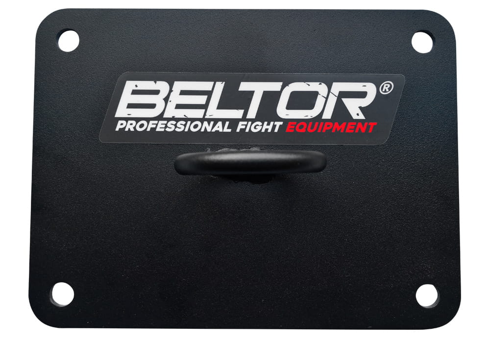Wzmocniony zestaw montażowy do worków treningowych. Dzięki zastosowaniu wzmocnionej stali grubości 3 mm oraz dużemu rozstawowi śrub mocowanie jest w stanie wytrzymać obciążenie do 150 kg.