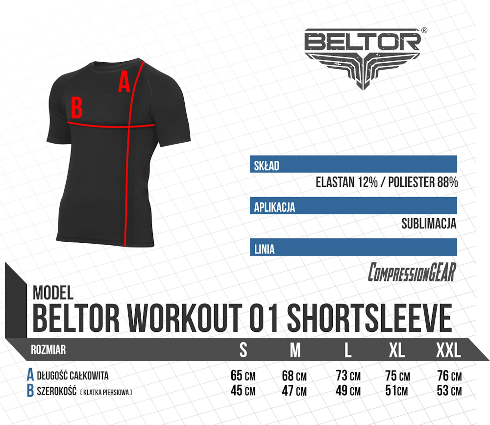 Rashguard Workout marki Beltor wyprodukowany z wysokiej jakości tkaniny dopasowującej do ciała. Rashguardy Beltora charakteryzują się wysokim poziomem kompresyjności, przez co mięśnie utrzymują odpowiednie podczas treningu napięcie. Ultra gładka i nieograniczająca ruchu tkanina poprawia termoregulację organizmu utrzymując skórę suchą i ciepłą.