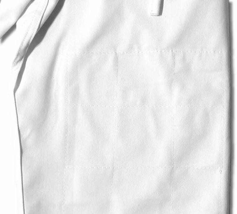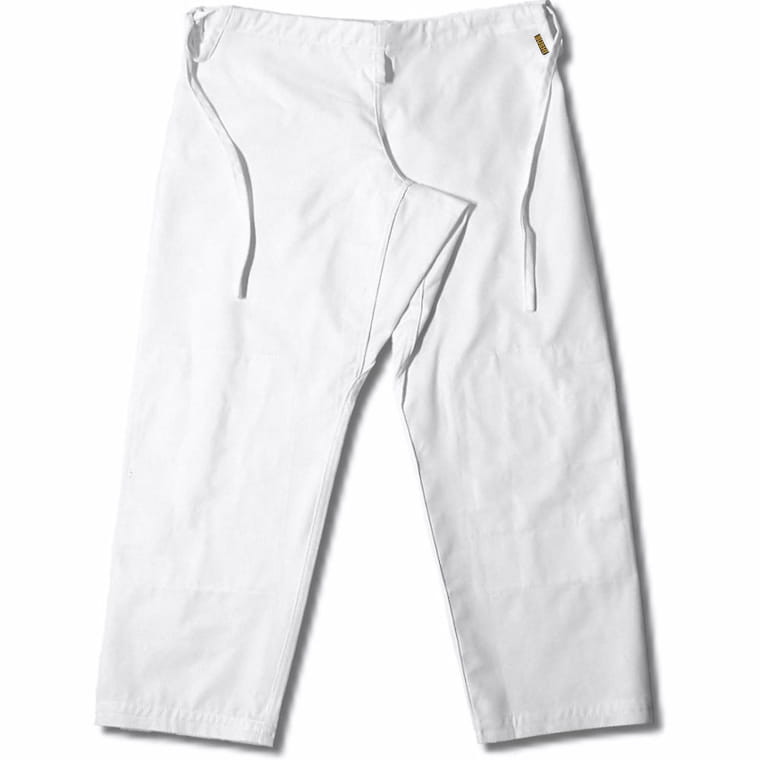 Białe spodnie do judo wykonane z bardzo mocnej bawełny. Wytrzymałe, dobrze znoszą intensywne treningi i mocne szarpnięcia. Tkanina - bawełna 100%, gramatura tkaniny 10oz (280g/m2). Trwałe i wygodne, posiadają klin w kroku i wzmocnienia na kolanach. Idealne także do treningów aikido i ju-jitsu. Wiązane na troczki.