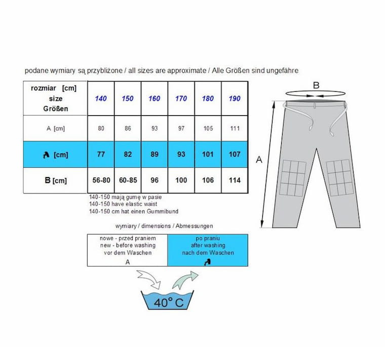 UWAGA: Na osoby o wzroście faktycznym 150-159cm zazwyczaj dobre są spodnie w rozmiarze 150cm. Analogicznie - na osoby o wzroście faktycznym 160-169cm dobre będą spodnie w rozmiarze 160cm. Na osoby o wzroście 170-179cm dobre będą spodnie w rozmiarze 170cm itd.