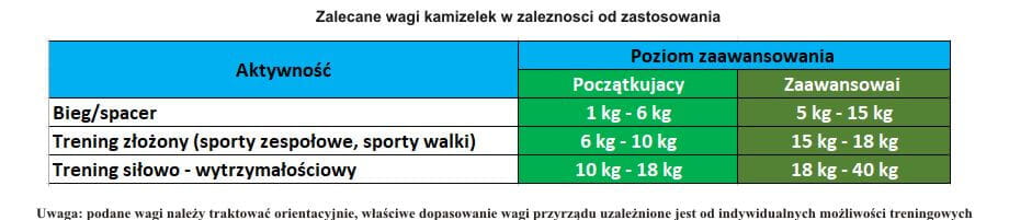 W kamizelce znajdują się 6 wkładów po 1,65 kg, dzięki czemu można uzyskać łączną maksymalną masę 10 kg. Pozwala to na dostosowanie wagi do indywidualnych potrzeb i stopnia zaawansowania. Wkłady zabezpieczone są rzepami, które utrzymują je w odpowiednim miejscu.