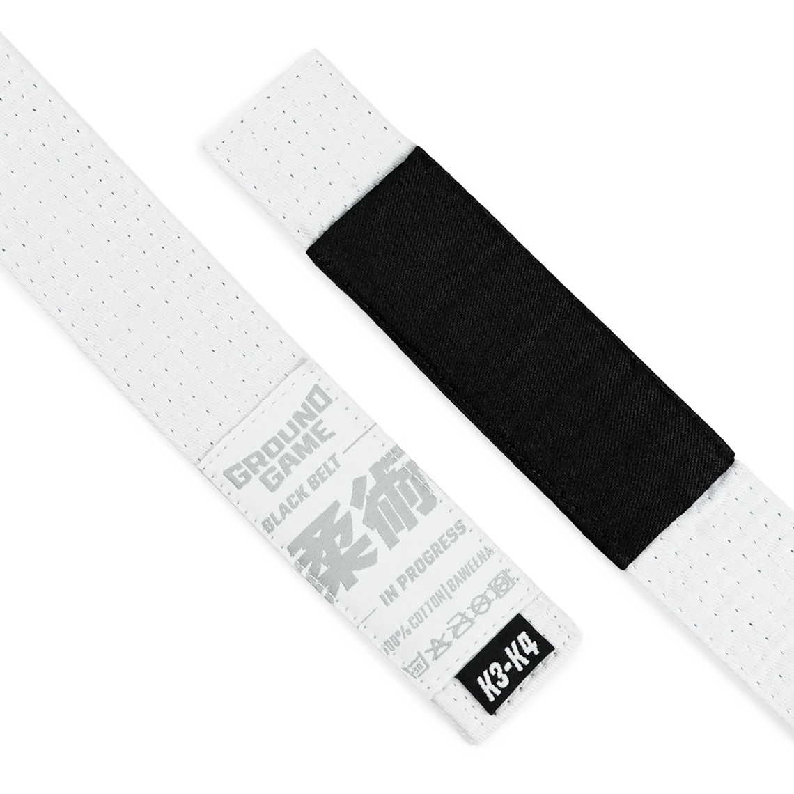 Biały pas do BJJ - brazylijskiego jiu jitsu. Posiada specjalny czarny panel na belki. Wysoka jakość wykonania. Głęboka biel oraz odpowiednia sztywność pasa zapewniają jego nienaganną prezencję.