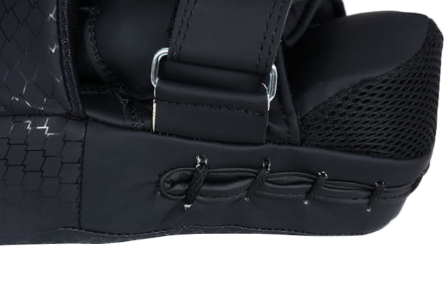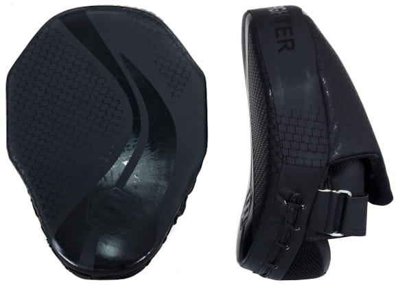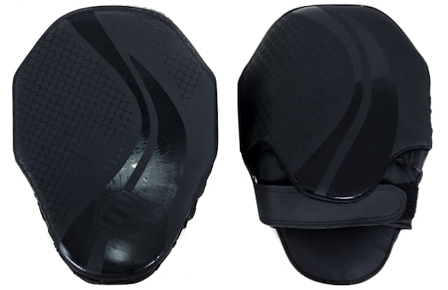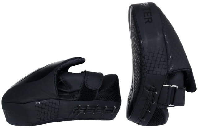 Tarcze - łapy trenera wykonany ze skóry syntetycznej, wypełnione średniej twardości regeneratem. Wykonane ze skóry syntetycznej. Łapy bardzo dobrze amortyzują uderzenia co wpływa na poprawę jakości i komfortu treningu. Mocowanie tarcz stanowi rękaw w kształcie rękawiczki z wszytą dodatkową osłoną na palce co umożliwia właściwe i stabilne utrzymanie tarczy. Dodatkowym zabezpieczeniem jest zapięcie na rzep na wysokości nadgarstka. Artykuł doskonale sprawdza się podczas treningów uderzeń bokserskich. Profil tarcz szczególnie predysponuje je do treningu ciosów sierpowych i tzw. haków oraz do nauczania walki w tzw. "półdystansie".