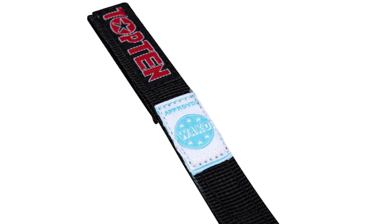 Tylny rzep do kasku z naszywką WAKO. Zgodnie z przepisami WAKO, od 2025 roku kaski na zawody muszą mieć widoczną naszywkę WAKO na taśmie z rzepem z tyłu głowy.